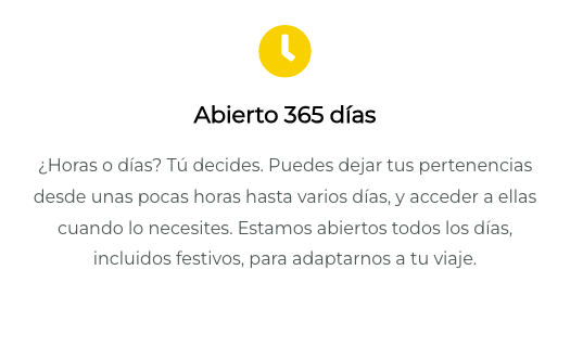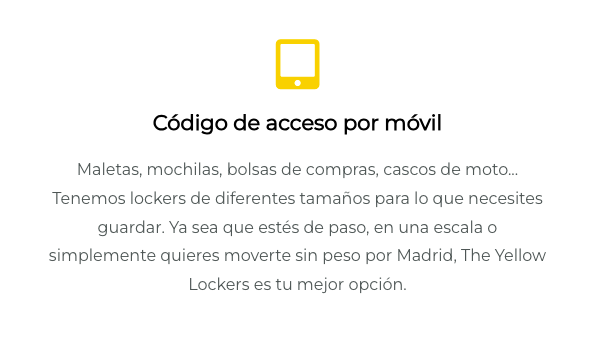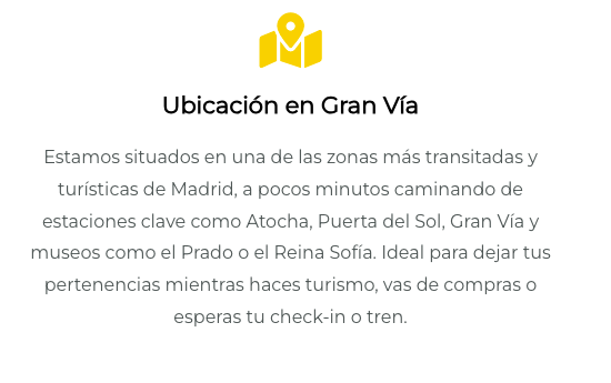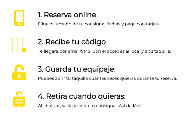En The Yellow Lockers sabemos que tu tiempo en Madrid es valioso y que lo último que quieres es arrastrar maletas por la ciudad. Por eso, te ofrecemos un servicio de consigna de equipajes cómodo, fácil de usar, seguro y 100% automatizado, para que puedas disfrutar de la capital sin cargas ni preocupaciones.